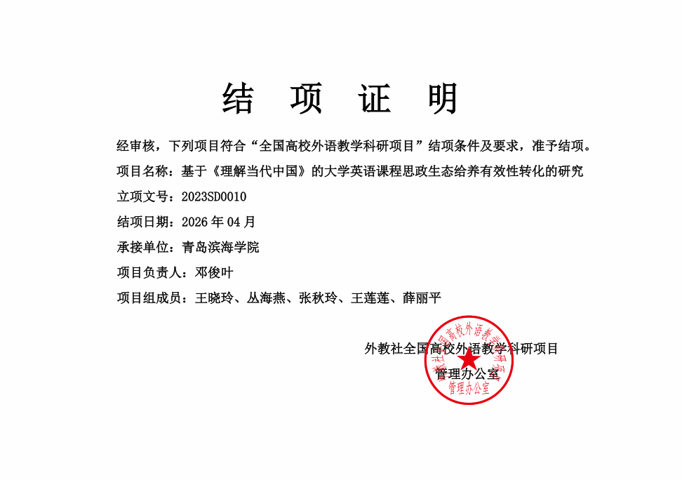 近日,青岛滨海学院2项全国高校外语教学科研项目顺利通过结项验收,标志着学校在外语教学与课程思政融合研究领域取得重要进展。