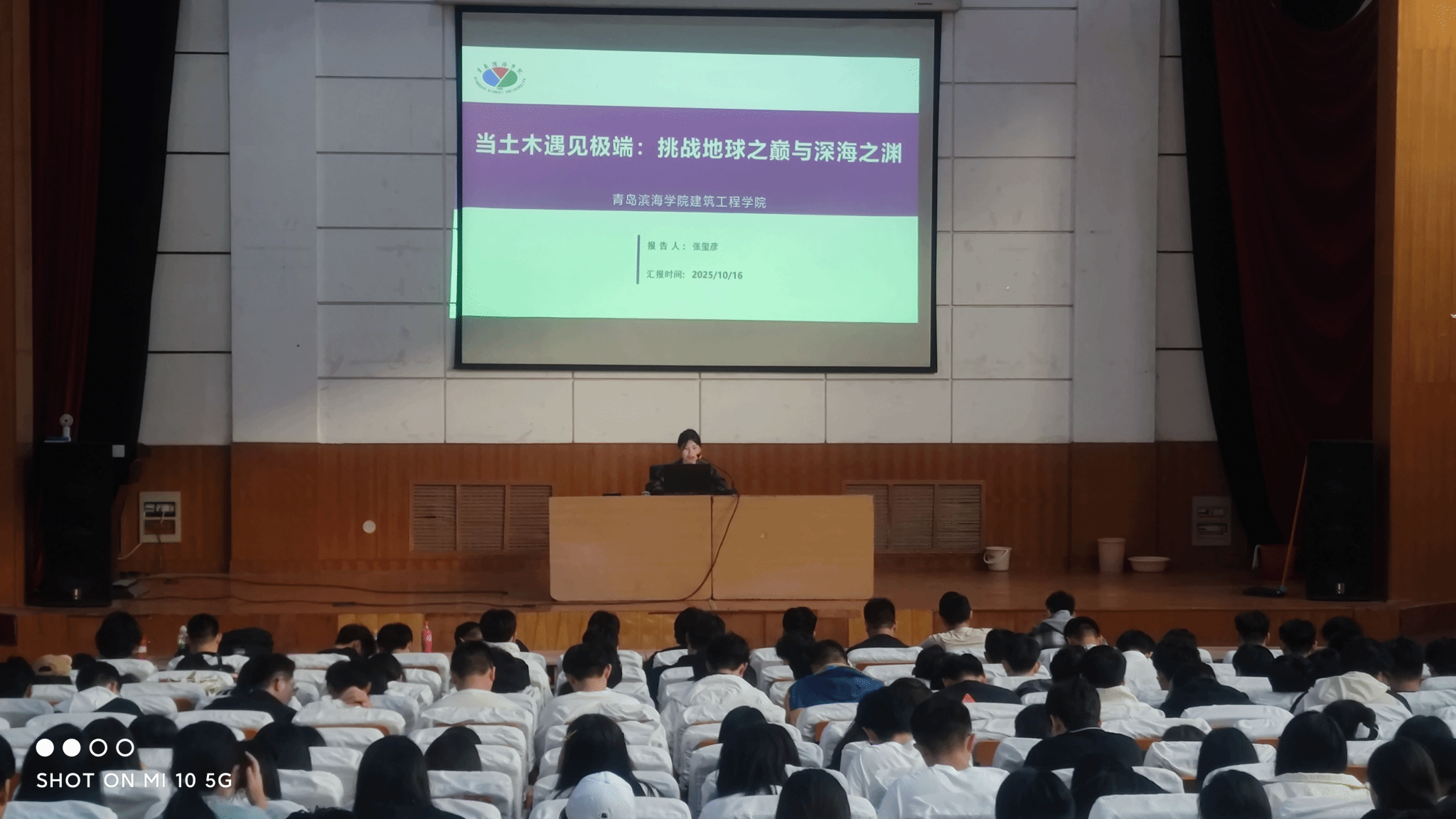 2025年10月16日下午,青岛滨海学院科研处成功举办了小珠山校区“滨海讲坛”第一讲,由建筑工程学院张玺彦老师主讲,主题为“当土木遇见极端:挑战地球之巅与深海之渊”,全校共有280余名同学参加了本次讲座。