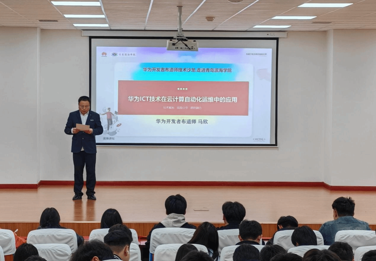 2025年10月23日下午,由我校信息工程学院主办的“华为开发者布道师技术沙龙·走进青岛滨海学院暨滨海讲坛·大珠山校区第一讲”在大珠山图书馆报告厅成功举办。本次活动的主题是华为ICT技术在云计算自动化运维中的应用。主办方邀请了华为开发者布道师,山东商业职业职业技术学院马欣老师作技术报告。来自信息工程学院的300余名师生参加了这次活动。